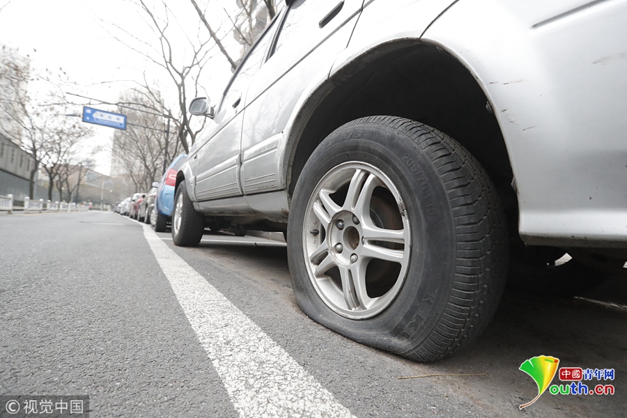 因為是免費停車位,就成為僵尸車的天堂。粗粗數(shù)了一遍,至少有10余輛汽車裹著車衣,被落葉等臟物覆蓋;有的車最后的年檢標(biāo)志是3年前,車胎漏氣,車內(nèi)也是堆著雜物。