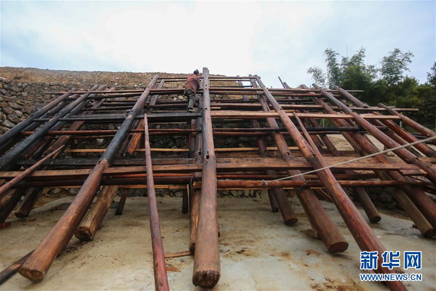 1月15日,在廣西融水苗族自治縣融水鎮(zhèn)夢嗚苗寨,工人在吊腳樓的主要結(jié)構(gòu)上施工,準(zhǔn)備起樓。新華社記者 陳君清 攝