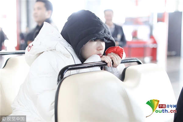 周冬雨連衣帽罩頭襯托小臉 下巴擱在行李車推桿呆萌可愛