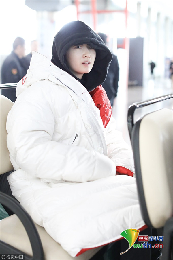 周冬雨連衣帽罩頭襯托小臉 下巴擱在行李車(chē)推桿呆萌可愛(ài)