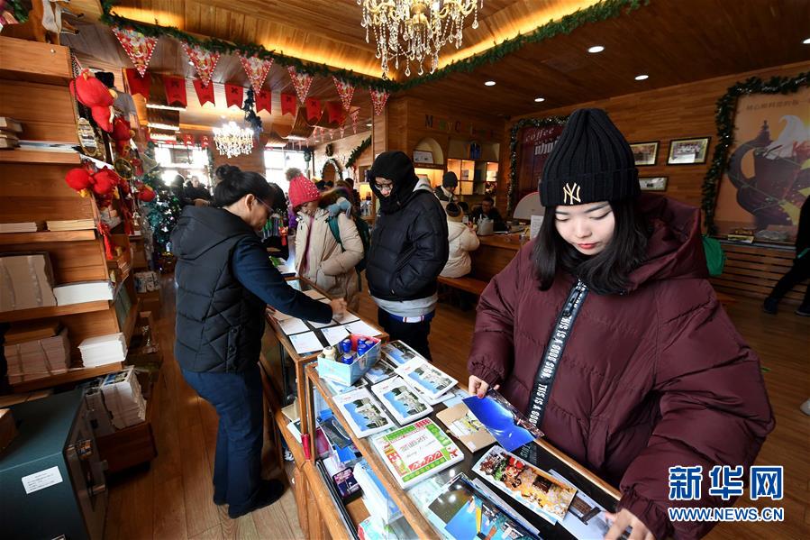 1月24日,在黑龍江省漠河市北極村郵政局,游客在挑選明信片。該郵政局是我國最北的郵政局。新華社記者王毓國攝