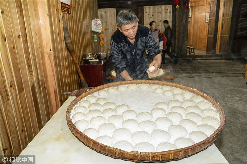 重慶江津區(qū)中山古鎮(zhèn)第十四屆 “千米長宴”民俗文化節(jié)盛大啟幕。上午10時,中山古鎮(zhèn)老街人聲鼎沸,窄窄的青石板路打掃得干干凈凈,家家戶戶門口掛起喜慶的紅燈籠,老商鋪門口擺滿了米酒、烤糍粑、煙熏豆腐……此次“千米長宴”以“絲路情緣,‘埃’上中山”為主題。“千米長宴”期間,游客們不僅可以一雙筷子吃遍全街,還可欣賞到祈福祭祀、民俗拜年、“打盆上菜”等表演,同時還增設(shè)了以唱、跳、講故事的上菜方式情景演繹愛情主題的文化餐飲,展示富硒愛情宴的文化內(nèi)涵。圖為街坊們在頭天就開始準備各種菜肴與小吃。