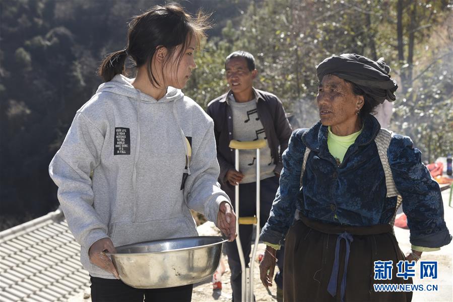 1月24日,在云南省蘭坪縣,褚福妹(左)在準(zhǔn)備“喬遷飯”時(shí)和奶奶交流。