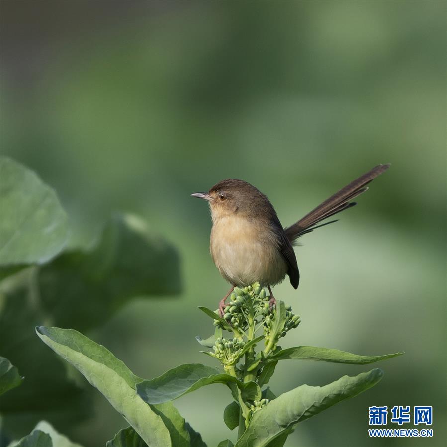 一只小鳥在油菜花枝頭上停歇(2月15日攝)。 新華社記者梅永存攝