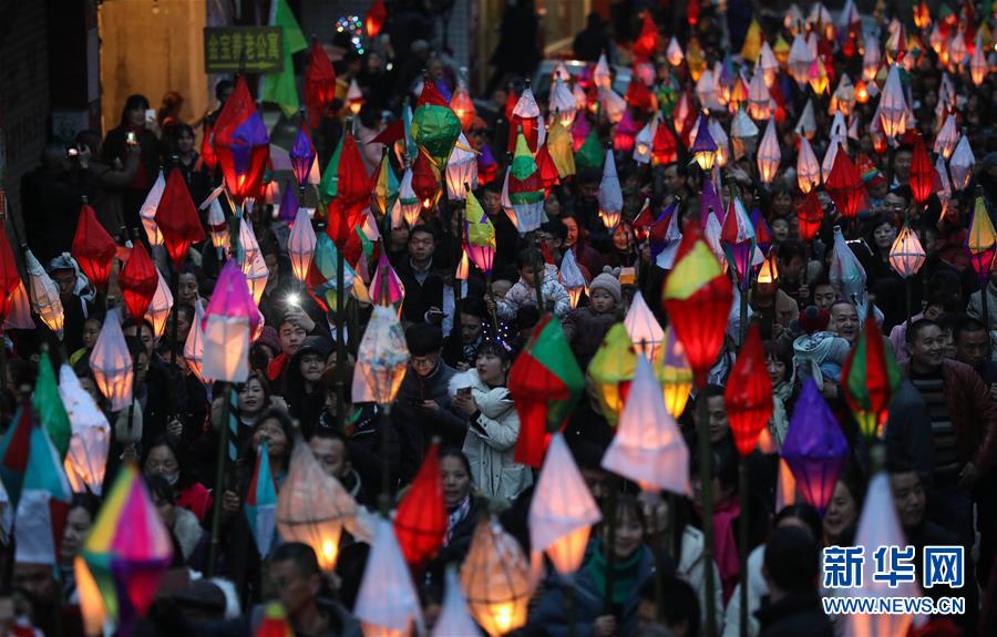 2月18日,在四川省南充市嘉陵區(qū)金寶鎮(zhèn),群眾舉著“蠐蟆燈”巡游。 當(dāng)日是農(nóng)歷正月十四,夜幕降臨后,川渝等地數(shù)萬名群眾在四川省南充市嘉陵區(qū)金寶鎮(zhèn)匯聚,點(diǎn)亮“蠐蟆燈”,敲著鑼鼓唱著歌謠,將“蠐蟆”送到幾公里外的田邊或者河邊燒掉,祈福健康平安。星星點(diǎn)點(diǎn)的燈光在鄉(xiāng)間小路閃爍移動,場面壯觀熱烈。 “送蠐蟆”祈福這一習(xí)俗源于清朝,歷經(jīng)演變成為川東北地區(qū)一個古老而神秘的地方民俗節(jié)日。 新華社記者 江宏景 攝