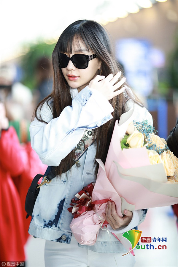 2019年2月24日,上海,楊穎現身機場。她全白套裝現身身材十分纖細,手捧粉絲送的花與小粉絲合影,十分親切。