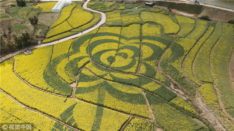 近日,在云南省安寧市山口村,油菜花田里“長出”一朵巨大的“山茶花”,吸引游客到此觀賞拍照。圖為3月1日,航拍油菜花田中的山茶花圖案。劉冉陽(云南分社)/中新社/視覺中國