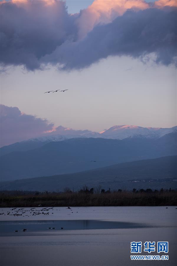 3月7日,在以色列阿格蒙胡拉鳥類和自然公園,幾只灰鶴在水邊休息。新華社記者郭昱攝