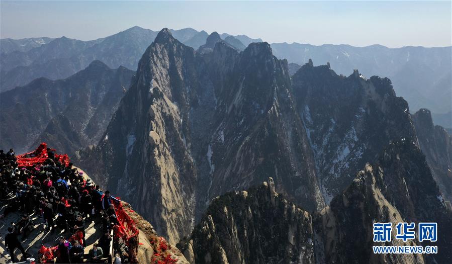 3月9日,游人在華山南峰游覽(無(wú)人機(jī)拍攝)。 隨著氣溫回升,陜西著名風(fēng)景區(qū)華山進(jìn)入旅游旺季。 新華社記者 陶明 攝