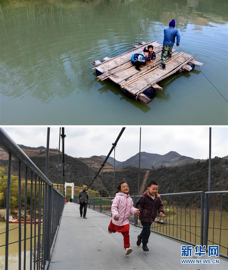這是一張拼版照片:上圖為略陽縣徐家坪鎮(zhèn)藥木院村江口壩組的余皓軒(左)、劉紫涵(中),由余皓軒的外公劉德安撐上簡易木筏,去對岸的幼兒園上學(xué)(2018年11月22日無人機(jī)拍攝);下圖為余皓軒(前右)、劉紫涵(前左)放學(xué)歸來,手拉手走在新修的鋼結(jié)構(gòu)吊橋上(2019年3月25日攝)。