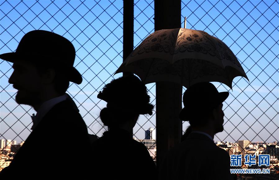 3月30日,在法國巴黎,音樂劇《300米高塔》的演員身著19世紀(jì)服裝站在埃菲爾鐵塔一層平臺上。于1889年3月31日正式落成的法國巴黎埃菲爾鐵塔迎來130歲生日。從30日起,包括演出、冒險(xiǎn)游戲、圖片展在內(nèi)的多項(xiàng)活動在埃菲爾鐵塔舉行,為這座宏偉建筑慶生。新華社記者 高靜 攝