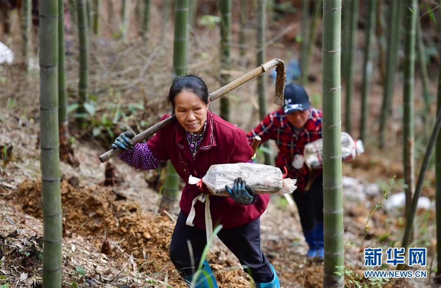 在廣西融水苗族自治縣桿洞鄉(xiāng)桿洞村,村民在竹林下種植靈芝菌棒(3月29日攝)。