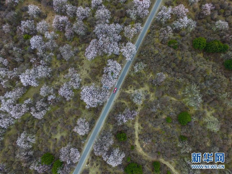 這是經(jīng)過(guò)林芝波密境內(nèi)桃花叢的公路(2016年4月1日無(wú)人機(jī)拍攝)。 新華社記者 普布扎西 攝