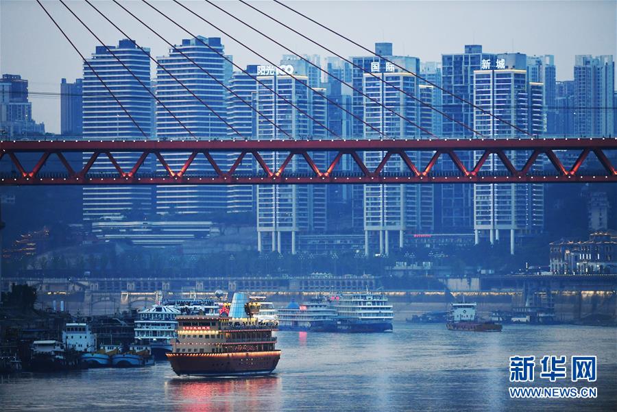 這是4月5日拍攝的夜幕下的重慶朝天門碼頭一帶景象。 千里為重,廣大為慶。城在山水間、山水在城中,重慶頗具特色的立體城市景觀是城市靚麗的名片。 新華社記者 王全超 攝
