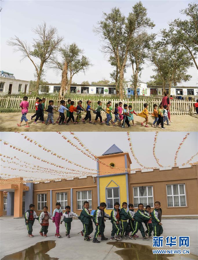 拼版照片:上圖為新疆于田縣達里雅布依鄉(xiāng)小學(xué)的學(xué)生走在校園里(2018年9月5日攝);下圖為學(xué)生們在達里雅布依小鎮(zhèn)易地扶貧安置點的新校舍前(2019年3月20日攝)。新華社記者 胡虎虎 攝