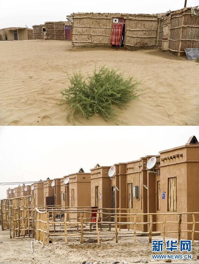 拼版照片:上圖為新疆于田縣達里雅布依鄉(xiāng)的民居(2018年9月7日攝);下圖為達里雅布依小鎮(zhèn)易地扶貧安置點的房屋(2019年3月20日攝)。新華社記者 胡虎虎 攝