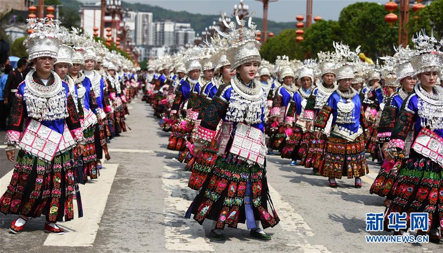 4月18日,臺江縣苗族群眾參加盛裝游演活動。 當日,貴州省黔東南苗族侗族自治州臺江縣迎來一年一度的苗族姊妹節(jié)。節(jié)日期間將舉行苗族盛裝游演、千人長桌宴、千人游方體驗、苗族手工創(chuàng)意大賽等一系列活動。 姊妹節(jié)是臺江縣苗族同胞的傳統(tǒng)節(jié)日,2006年被列入第一批國家級非物質(zhì)文化遺產(chǎn)名錄。 新華社記者 楊文斌 攝