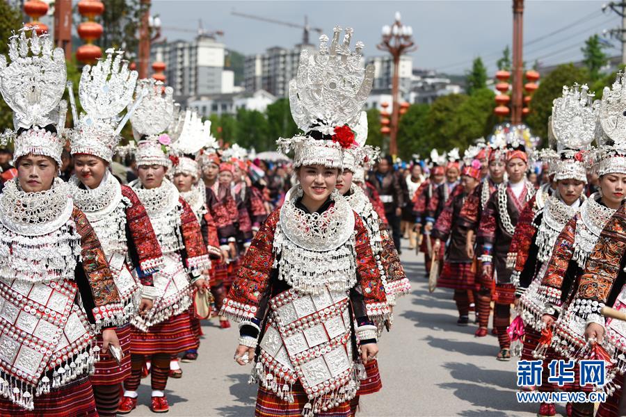 4月18日,臺江縣苗族群眾參加盛裝游演活動。 當(dāng)日,貴州省黔東南苗族侗族自治州臺江縣迎來一年一度的苗族姊妹節(jié)。節(jié)日期間將舉行苗族盛裝游演、千人長桌宴、千人游方體驗、苗族手工創(chuàng)意大賽等一系列活動。 姊妹節(jié)是臺江縣苗族同胞的傳統(tǒng)節(jié)日,2006年被列入第一批國家級非物質(zhì)文化遺產(chǎn)名錄。 新華社記者 楊文斌 攝