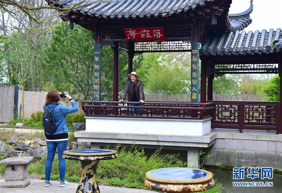 2019年4月13日,在德國(guó)曼海姆,游客在中式園林“多景園”內(nèi)拍照?!岸嗑皥@”位于曼海姆市路易森公園內(nèi),占地約6000平方米,建筑面積約1500平方米,是目前歐洲最為完整的中國(guó)古典園林建筑群落之一。 新華社記者逯陽(yáng)攝