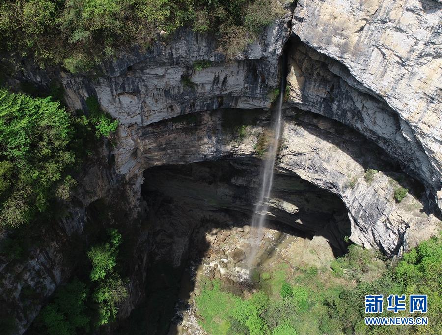 地洞河天坑底部的一處瀑布(4月22日攝)。位于陜西省漢中市寧強(qiáng)縣的地洞河天坑,是禪家?guī)r天坑群中規(guī)模最大的一處天坑,坑內(nèi)分布有石鐘乳、石筍,具有極高的地質(zhì)研究?jī)r(jià)值。 新華社記者 張博文 攝