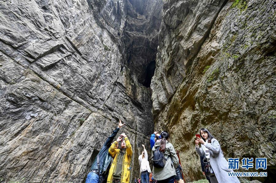 游客在天生三橋景區(qū)內(nèi)的天龍橋景點(diǎn)游覽(3月27日攝)。 隨著天氣轉(zhuǎn)暖,重慶武隆天生三橋景區(qū)風(fēng)景如畫,氣勢(shì)磅礴的天生石橋和綠意盎然的山林相映成趣,吸引眾多游客前來踏春賞景。 新華社記者劉潺攝