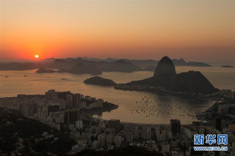 這是2015年8月7日在巴西里約熱內(nèi)盧拍攝的日出時分的瓜納巴拉灣和面包山。 新華社記者徐子鑒攝