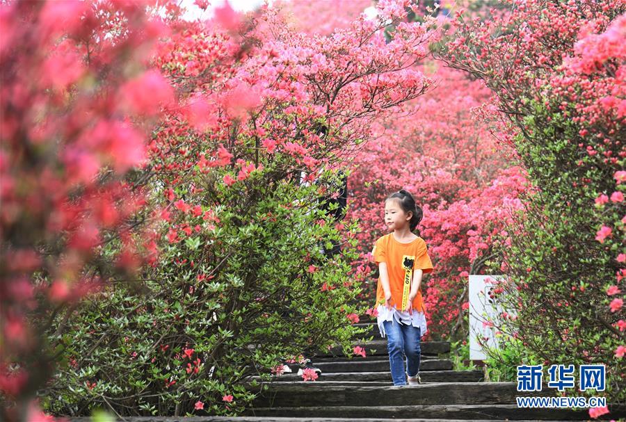 4月25日,游客在龜峰山杜鵑花海中游玩。 近日,湖北省麻城市龜峰山的10萬畝古杜鵑盛開,大量游客前來賞花觀景。 新華社記者 程敏 攝