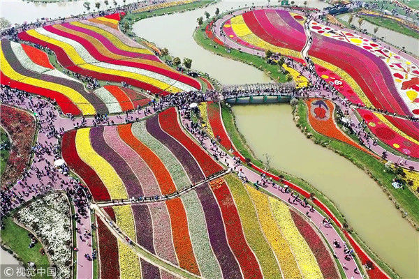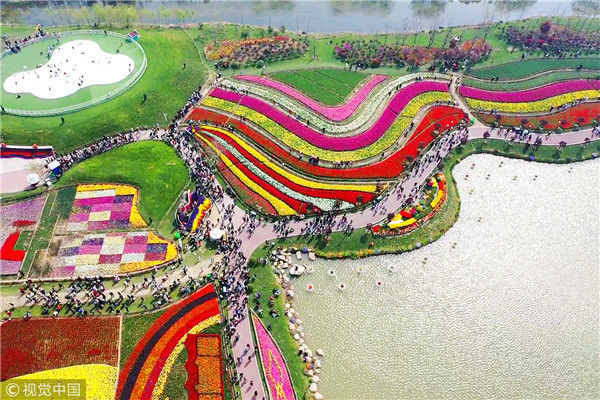 2019年4月6日,江蘇鹽城,大豐荷蘭花海景區(qū),人們?cè)谫p花游玩,盡享春光。