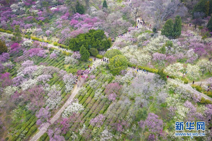 游客在江蘇南京梅花山賞花(3月8日無(wú)人機(jī)拍攝)。 新華社發(fā)(蘇陽(yáng) 攝)