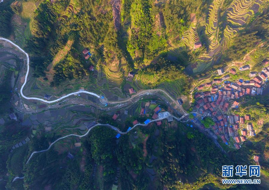 這是春耕時節(jié)的黔桂烏英苗寨梯田(4月16日無人機(jī)拍攝)。 新華社記者 黃孝邦 攝