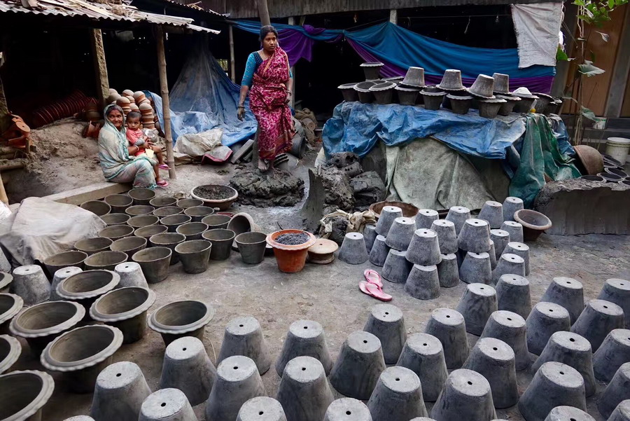 達(dá)卡遠(yuǎn)郊區(qū)一個(gè)印度教徒聚居的村莊,幾乎家家戶(hù)戶(hù)都開(kāi)辦制陶作坊,以傳統(tǒng)工藝制作陶盆、陶罐、陶盤(pán)和建筑裝飾陶器,遠(yuǎn)銷(xiāo)孟加拉國(guó)內(nèi)各地。李仁奇 攝
