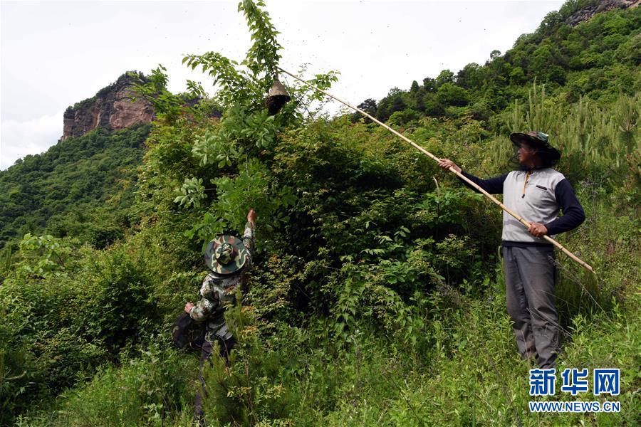 5月10日,在甘肅省隴南市徽縣大河店鎮(zhèn)硬灣村,蜂農(nóng)周仲頤(右)在收蜂。 甘肅省隴南市徽縣大河店鎮(zhèn)硬灣村位于秦巴山區(qū)深處,2017年,在當(dāng)?shù)卣姆龀窒?,龍崖老巢蜜養(yǎng)殖農(nóng)民專業(yè)合作社成立,蜂農(nóng)們將傳統(tǒng)養(yǎng)蜂技藝和現(xiàn)代加工方式相結(jié)合,并通過電商等渠道打開銷路,有效帶動了當(dāng)?shù)刎毨Т迕衩撠氈赂弧D壳罢麄€合作社共有蜂箱2000余個,每箱每年可帶來三四千元的收入。 新華社記者 馬寧 攝