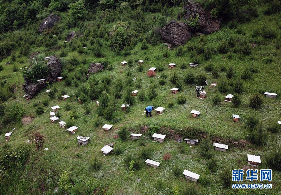 5月10日,在甘肅省隴南市徽縣大河店鎮(zhèn)硬灣村,蜂農(nóng)查看蜂箱情況(無(wú)人機(jī)拍攝)。 甘肅省隴南市徽縣大河店鎮(zhèn)硬灣村位于秦巴山區(qū)深處,2017年,在當(dāng)?shù)卣姆龀窒?,龍崖老巢蜜養(yǎng)殖農(nóng)民專業(yè)合作社成立,蜂農(nóng)們將傳統(tǒng)養(yǎng)蜂技藝和現(xiàn)代加工方式相結(jié)合,并通過(guò)電商等渠道打開銷路,有效帶動(dòng)了當(dāng)?shù)刎毨Т迕衩撠氈赂?。目前整個(gè)合作社共有蜂箱2000余個(gè),每箱每年可帶來(lái)三四千元的收入。 新華社記者 馬寧 攝
