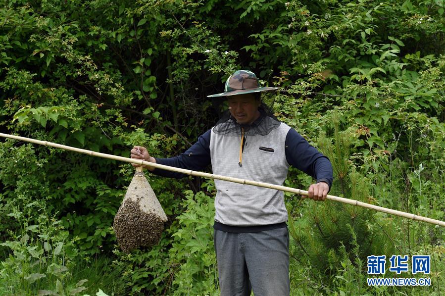 5月10日,在甘肅省隴南市徽縣大河店鎮(zhèn)硬灣村,蜂農(nóng)周仲頤在收蜂。 甘肅省隴南市徽縣大河店鎮(zhèn)硬灣村位于秦巴山區(qū)深處,2017年,在當(dāng)?shù)卣姆龀窒?,龍崖老巢蜜養(yǎng)殖農(nóng)民專業(yè)合作社成立,蜂農(nóng)們將傳統(tǒng)養(yǎng)蜂技藝和現(xiàn)代加工方式相結(jié)合,并通過電商等渠道打開銷路,有效帶動了當(dāng)?shù)刎毨Т迕衩撠氈赂弧D壳罢麄€合作社共有蜂箱2000余個,每箱每年可帶來三四千元的收入。 新華社記者 馬寧 攝