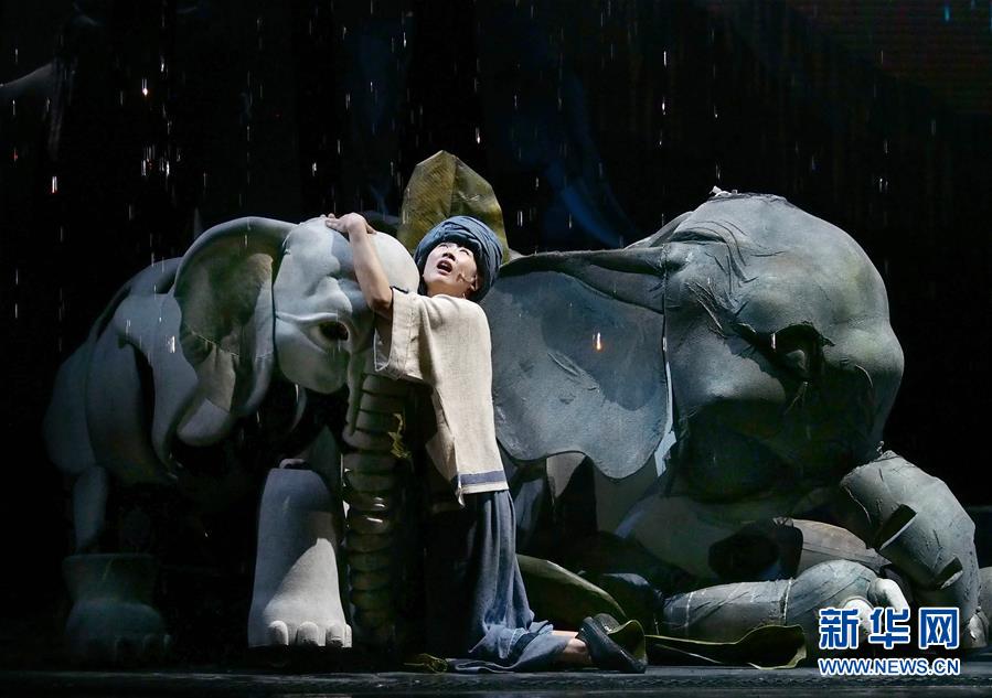 5月15日在上海美琪大戲院拍攝的新版大型人偶舞臺劇《最后一頭戰(zhàn)象》劇照。 當日,作為第12屆中國藝術節(jié)的參演劇目,大型人偶舞臺劇《最后一頭戰(zhàn)象》在經過4次硬件技術升級和故事修改后亮相上海美琪大戲院。 新華社記者 任瓏 攝