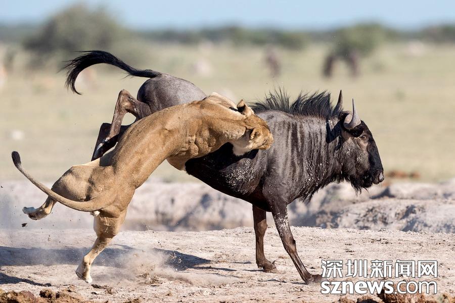 英國攝影師蘇-莫里斯(Sue Morri)在博茨瓦納Nxai Pan國家公園游玩,目睹了一場兇惡母獅獵食角馬的畫面。母獅甚至攀到了角馬背上,想要牢牢遏制住到手的“美餐”。強(qiáng)壯的角馬努力地與母獅抗?fàn)帲吡ο胍W∽约旱男悦?,但最終還是不敵母獅被拿下,最后成了母獅孩子們的盤中餐。