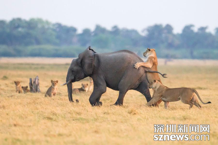 英國攝影師詹姆斯(James Gifford)在博茨瓦納喬貝國家公園拍到一群獅子獵食大象的精彩畫面。在詹姆斯的鏡頭下,一頭母獅跳到了一頭小象的背上想要將其拿下,但僅憑一己之力又不能做到。但當(dāng)母獅的后援抵達(dá)時(shí),象群也趕到了現(xiàn)場。最終,小象回到了象群中獲得庇護(hù),而獅群也不得不悻悻離去。