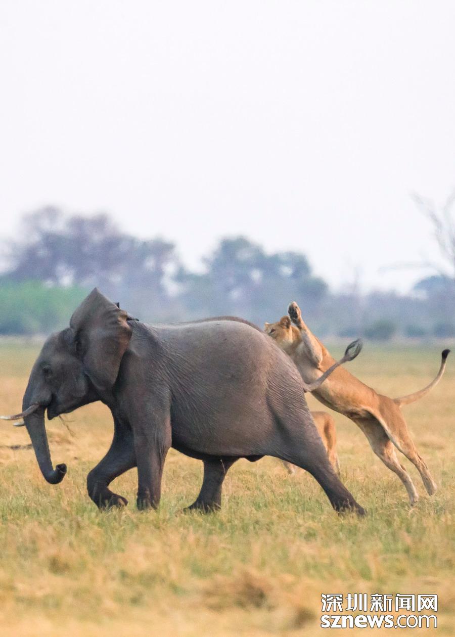 英國攝影師詹姆斯(James Gifford)在博茨瓦納喬貝國家公園拍到一群獅子獵食大象的精彩畫面。在詹姆斯的鏡頭下,一頭母獅跳到了一頭小象的背上想要將其拿下,但僅憑一己之力又不能做到。但當(dāng)母獅的后援抵達(dá)時(shí),象群也趕到了現(xiàn)場(chǎng)。最終,小象回到了象群中獲得庇護(hù),而獅群也不得不悻悻離去。