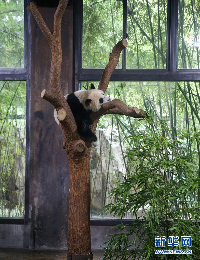 6月1日,在上海野生動(dòng)物園,大熊貓寶寶“七七”在樹上休息。當(dāng)日,上海野生動(dòng)物園舉行命名儀式,宣布一只10個(gè)月大的大熊貓寶寶被正式命名為“七七”。新華社記者丁汀攝