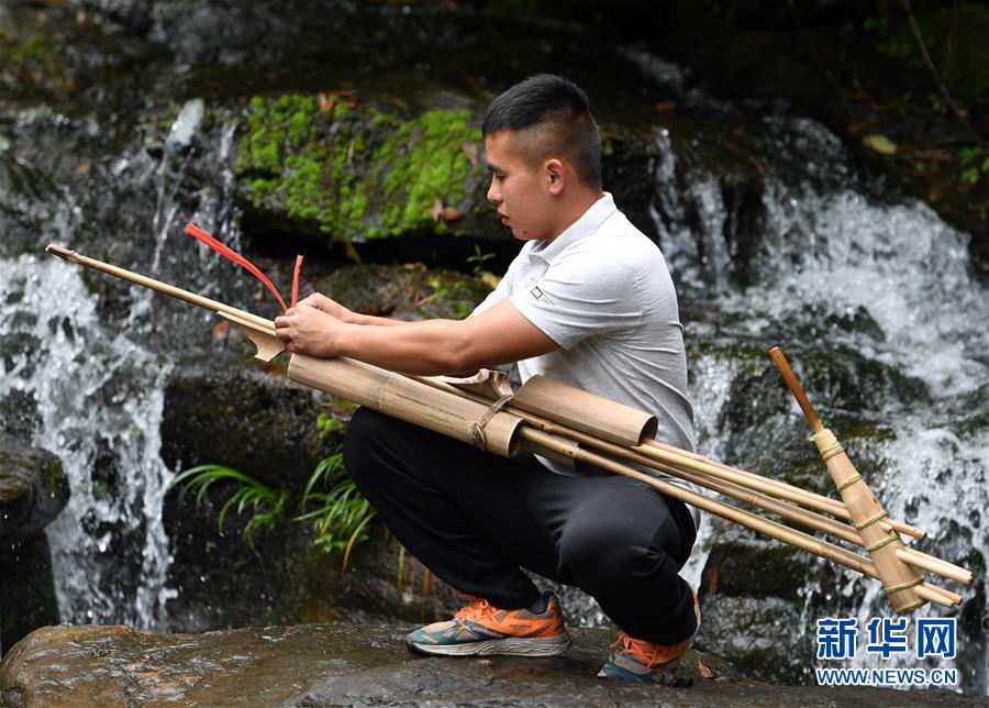 5月30日,在融水苗族自治縣安太鄉(xiāng)小桑村青山屯,杜信文在家門外調試一把剛剛制作完成的蘆笙。 新華社記者 陸波岸 攝