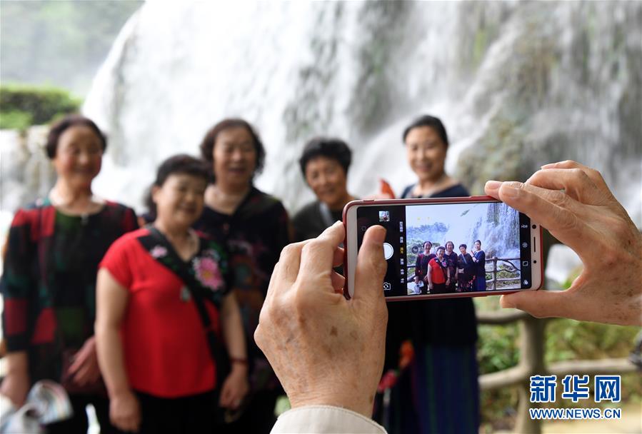 6月5日,游人在貴州赤水丹霞旅游區(qū)“美人梳”瀑布游覽。 貴州遵義赤水市有眾多大大小小的瀑布群,素有“千瀑之市”的美譽,飛瀑美景吸引八方游客前來賞景度假。 新華社記者鄭雅寧攝