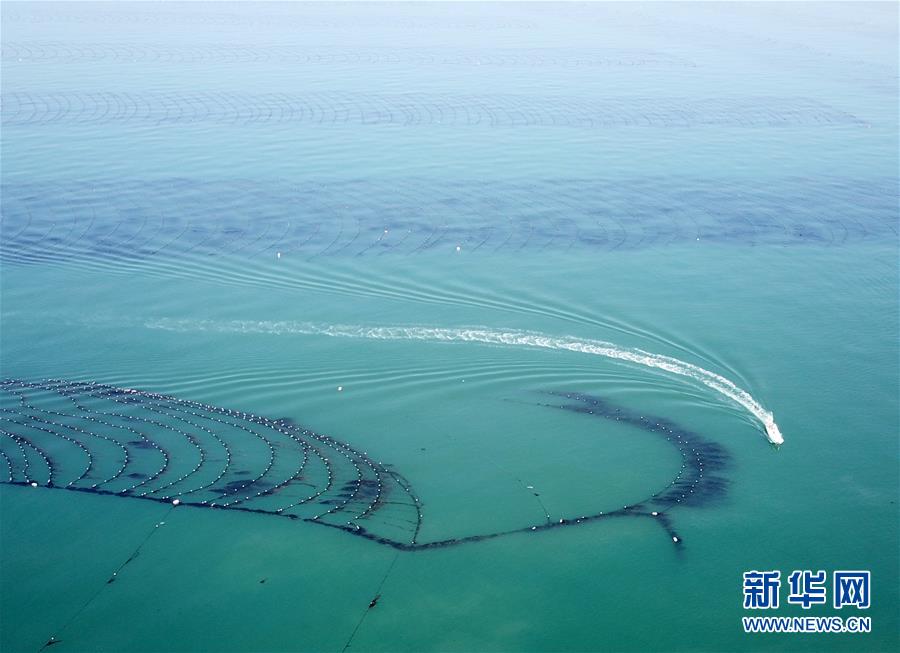 4月10日,霞浦縣長春鎮(zhèn)海域,海帶養(yǎng)殖戶在用船只收獲海帶(無人機拍攝)。近日,福建省寧德市霞浦縣30余萬畝養(yǎng)殖海帶進入收獲季節(jié),當?shù)仞B(yǎng)殖戶搶抓晴好天氣,收獲海帶。海帶養(yǎng)殖是霞浦縣群眾增收致富的支柱產(chǎn)業(yè)。2018年該縣海帶產(chǎn)量14萬余噸。新華社記者 姜克紅 攝