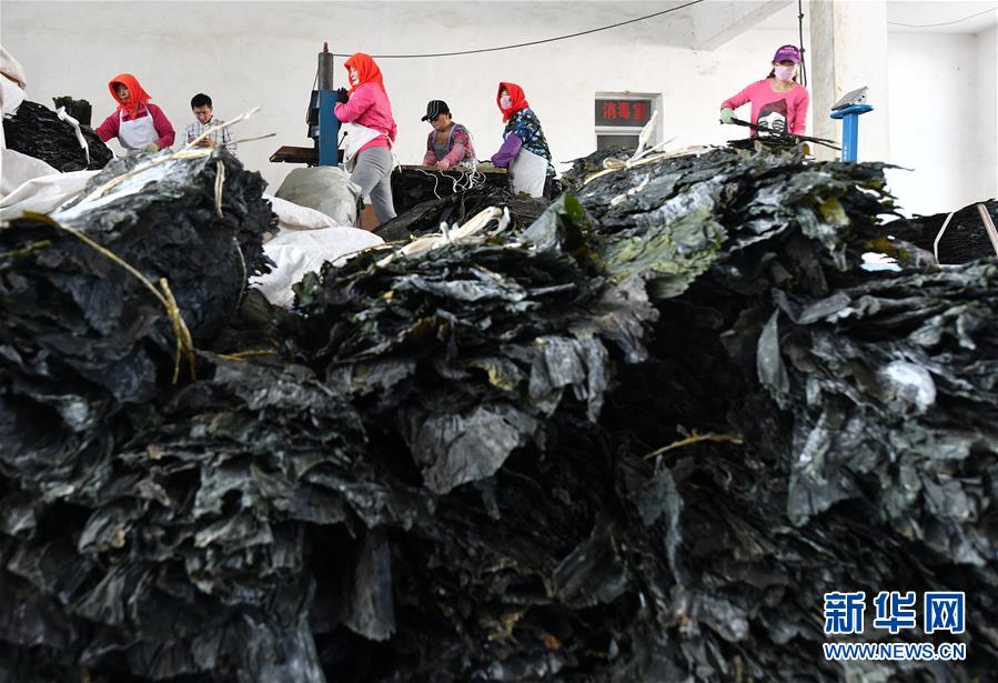 大欽島鄉(xiāng)東村居民在加工海帶(5月23日攝)。新華社記者 朱崢 攝