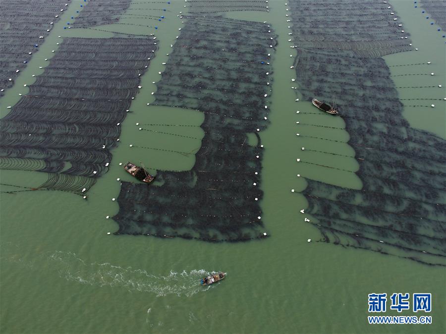 4月10日,霞浦縣長(zhǎng)春鎮(zhèn)海域,海帶養(yǎng)殖戶在用船只收獲海帶(無人機(jī)拍攝)。近日,福建省寧德市霞浦縣30余萬畝養(yǎng)殖海帶進(jìn)入收獲季節(jié),當(dāng)?shù)仞B(yǎng)殖戶搶抓晴好天氣,收獲海帶。海帶養(yǎng)殖是霞浦縣群眾增收致富的支柱產(chǎn)業(yè)。2018年該縣海帶產(chǎn)量14萬余噸。新華社記者 姜克紅 攝