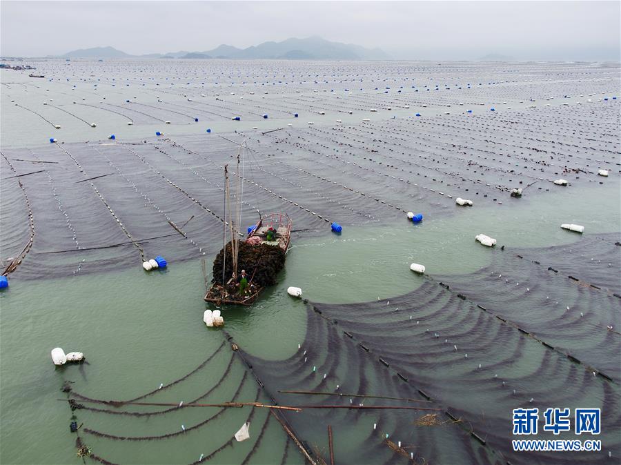 4月10日,霞浦縣長春鎮(zhèn)海域,海帶養(yǎng)殖戶在用船只運輸海帶(無人機拍攝)。近日,福建省寧德市霞浦縣30余萬畝養(yǎng)殖海帶進入收獲季節(jié),當?shù)仞B(yǎng)殖戶搶抓晴好天氣,收獲海帶。海帶養(yǎng)殖是霞浦縣群眾增收致富的支柱產(chǎn)業(yè)。2018年該縣海帶產(chǎn)量14萬余噸。新華社記者 姜克紅 攝
