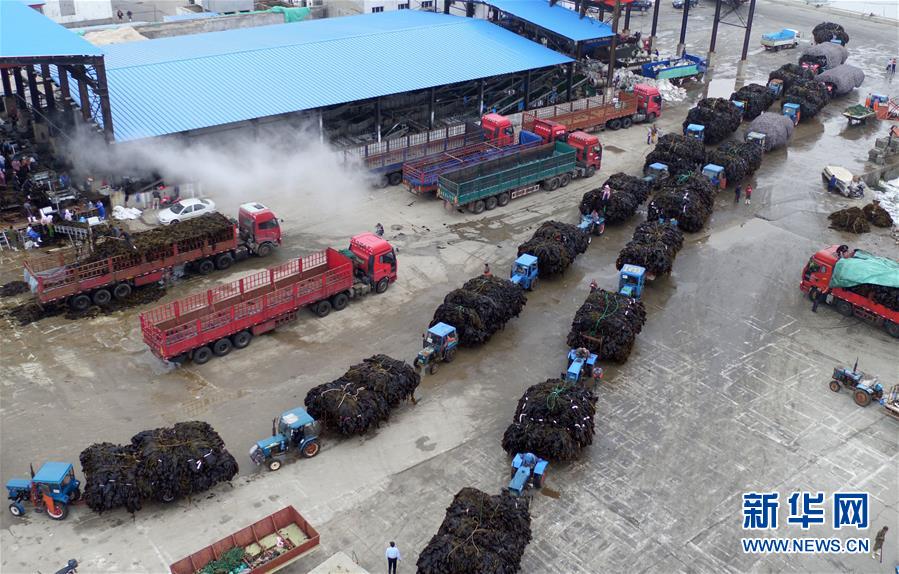 6月5日,在榮成市尋山街道青魚灘村,漁民在收獲海帶。 近日,山東省榮成市迎來海帶收獲季。據(jù)悉,榮成市海帶養(yǎng)殖面積14.5萬(wàn)畝,年產(chǎn)海帶43.3萬(wàn)噸以上。 新華社記者王凱攝