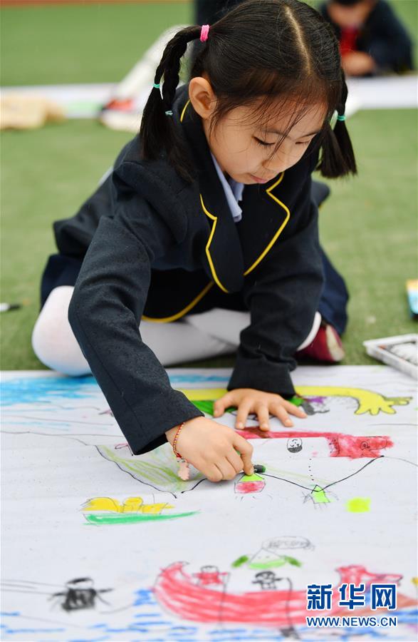 6月5日,陜西師范大學(xué)附屬小學(xué)的學(xué)生在長(zhǎng)卷上畫(huà)龍舟。