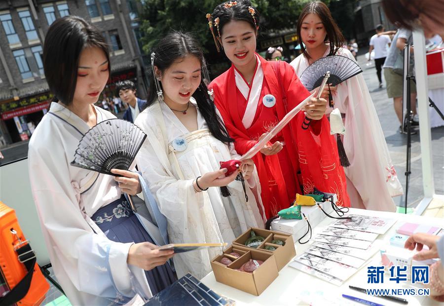 6月9日,在成都寬窄巷子,幾位漢服愛好者在香包、茶器等展臺駐足。新華社記者 江宏景 攝