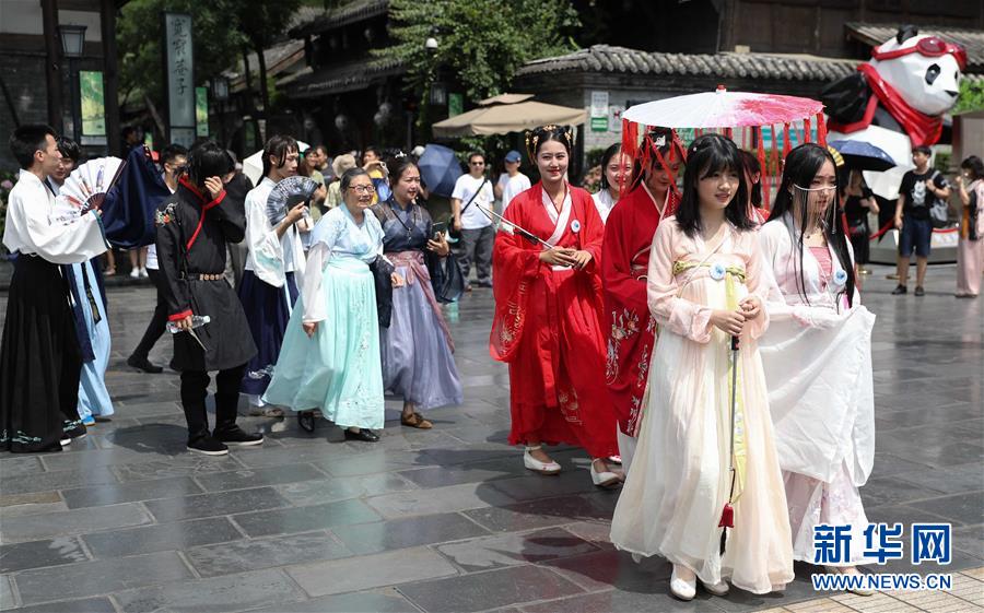6月9日,漢服愛好者在成都寬窄巷子巡游,宣傳“聞香識寬窄”主題活動。新華社記者 江宏景 攝