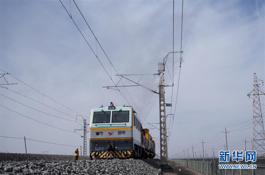 青藏鐵路公司西寧供電段格爾木大修車(chē)間的接觸網(wǎng)清洗車(chē)在清洗絕緣子(5月12日攝)。新華社記者白瑪央措攝